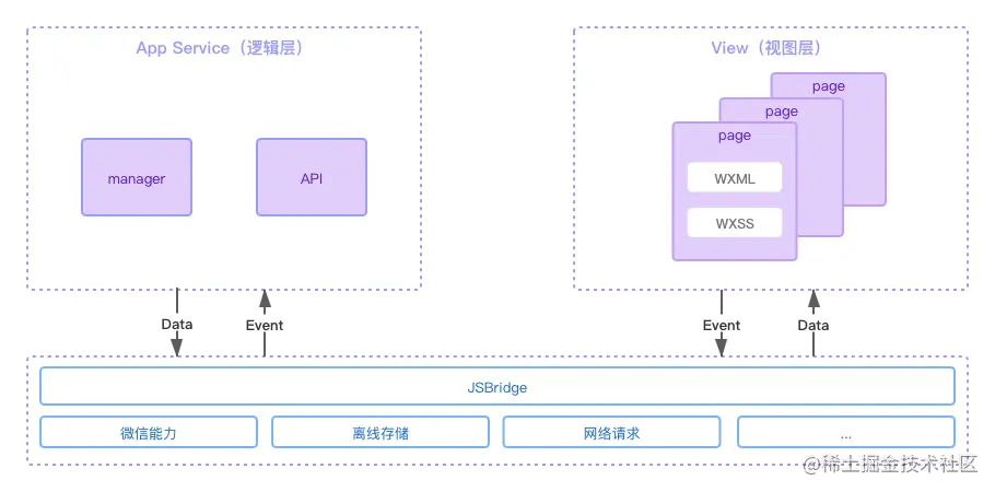 小程序相关 February 26, 2023 frontend 架构 # 渲染层的界面使用 webview 进行渲染;逻辑层采用 JSCore运行JavaScript代码 无论是线程之间的通讯、数据的传递、网络请求都由Native层做转发 框架 # Taro # 为了统一跨平台的开发方式,通过运行时框架、组件、API 去抹平多端差异 跨端 # 原生小程序 #